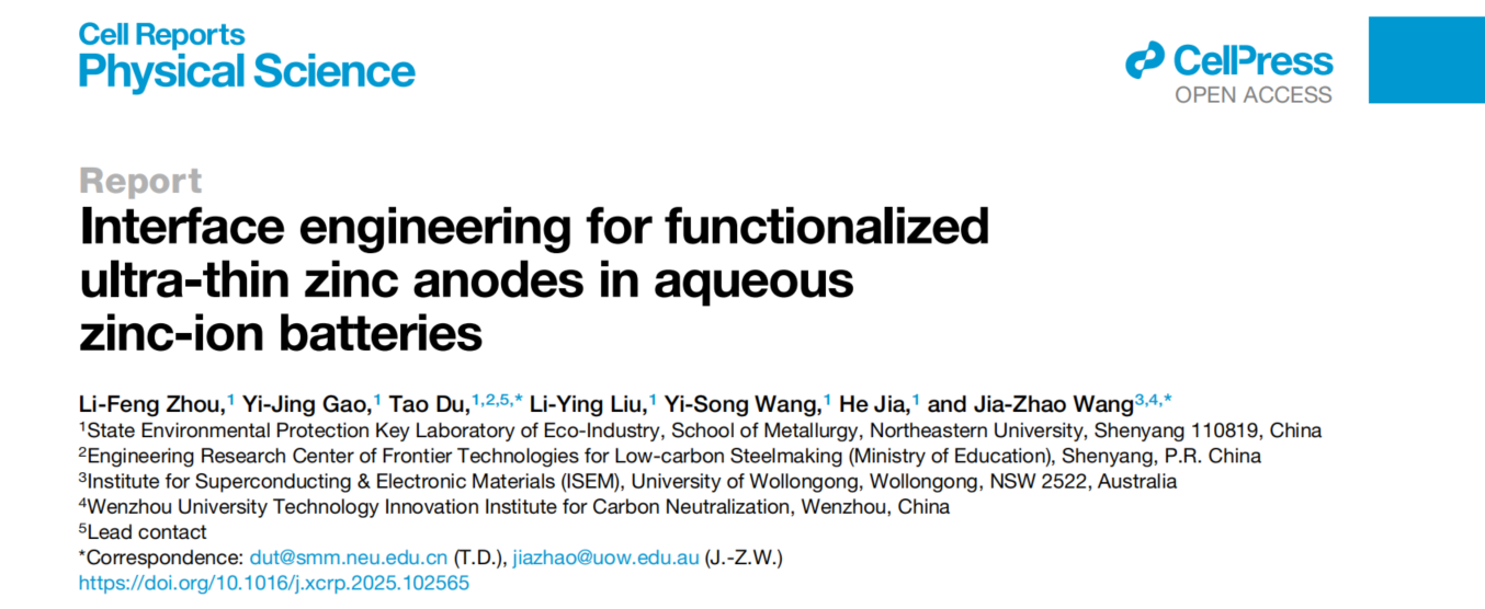 近日,必赢242net官网杜涛教授团队在水系锌离子电池负极研究领域取得了重要进展。研究成果以“Interface engineering for functionalized ultra-thin zinc anodes in aqueous zinc-ion batteries”为题,发表于国际权威期刊Cell旗下子刊Cell Reports Physical Science。必赢242net官网杜涛教授和澳大利亚伍伦贡大学王佳兆教授为共同通讯作者,必赢242net官网青年教师周立峰为第一作者,必赢242net官网为第一完成单位。
