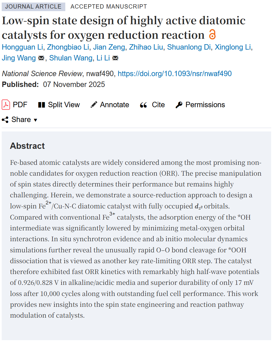 近日,必赢242net官网李犁教授课题组在能源催化材料领域取得重要突破,相关Research Article成果以《Low-spin state design of highly active diatomic catalysts for oxygen reduction reaction》为题,发表在中国顶级学术期刊《National Science Review》(国家科学评论)上。必赢242net官网博士研究生李宏观为论文第一作者,李犁教授为通讯作者,必赢242net官网为第一完成单位。