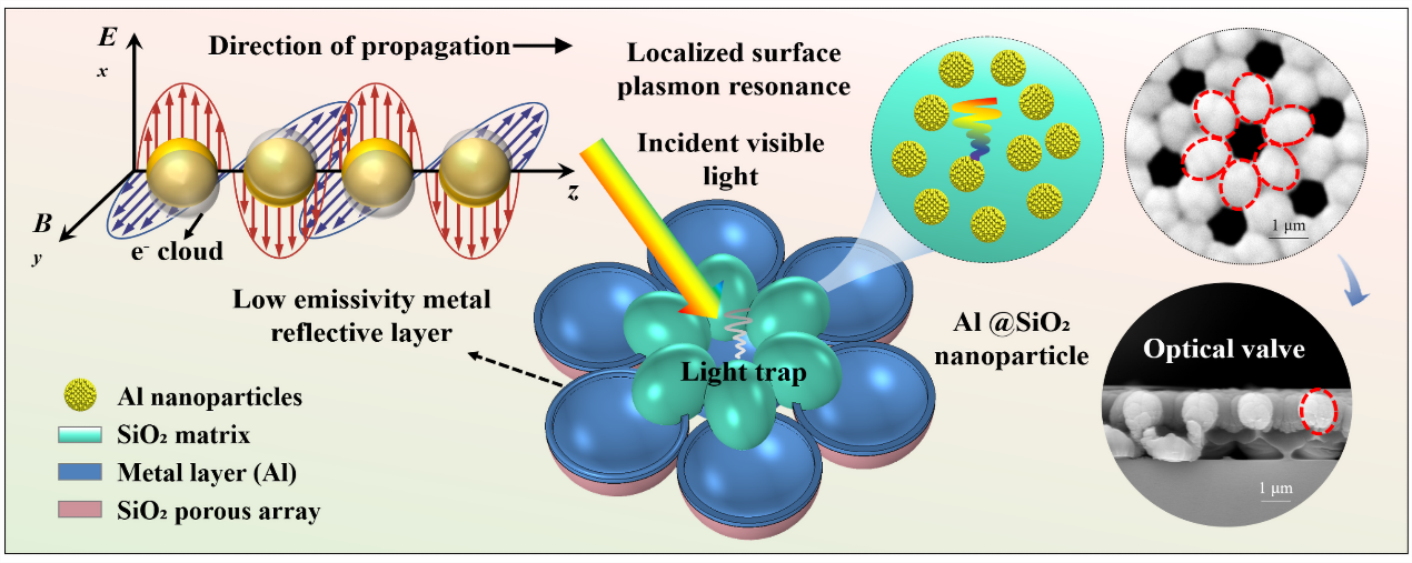 本研究提出了一种外场辅助制备的新型光学阀门等离子体(OV-PS)金属基电磁吸收材料,以实现红外/可见兼容隐身。与开孔结构相比,将光学阀集成于孔结构上可充当波长选择性开关,根据特定光谱波段调控光吸收。通过调节光学阀门单元的间距和尺寸,OV-PS金属基电磁吸收材料可在保持低可见反射率的同时,独立调控红外发射率。研究结果表明,OV-PS金属基电磁吸收材料可见反射率为9.95%,红外发射率低至0.08,有效突破了传统红外-可见兼容隐身材料的性能局限。此外,光学阀门的制备基于物理气相沉积技术,可实现功能单元与结构单元的协同设计,从而促进多功能集成与多光谱调控。OV-PS金属基电磁吸收材料的设计在国防、能源等领域具有重要应用潜力。